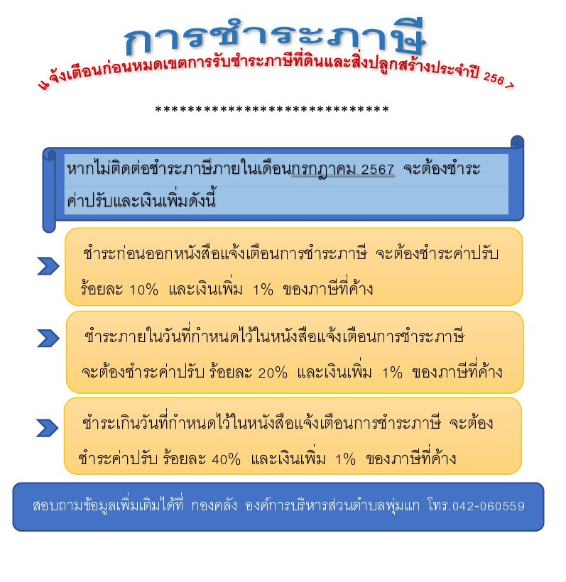 รายละเอียด : หากท่านไม่ติดต่อชำระภายในเดือน มิถุนายน 2567 จะมีหนังสือแจ้งเตือนการชำระภาษี ไปยังผู้ค้างชำระภาษี